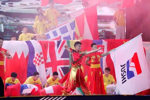 巨石產(chǎn)品遠(yuǎn)銷全球,巨石旗和數(shù)十面國旗在舞臺上縱情揮舞,五彩飄揚(yáng)的旗幟展現(xiàn)出巨石人勇敢走出去、堅(jiān)定走下去、健康走回來的自信與豪邁。