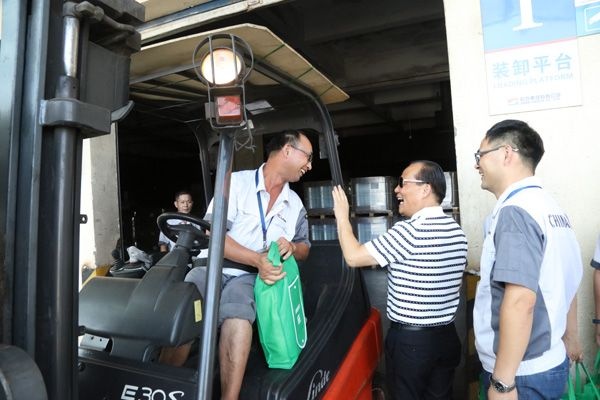 在二、三分廠發(fā)貨平臺(tái),張總仔細(xì)觀察倉(cāng)庫(kù)的運(yùn)作,看到叉車司機(jī)井井有條地將貨物裝進(jìn)集裝箱,張總熱情地和他們打招呼,親切地拍拍他們的肩膀,感謝他們辛苦工作,同時(shí)提醒他們注意安全,勞逸結(jié)合,小心中暑。