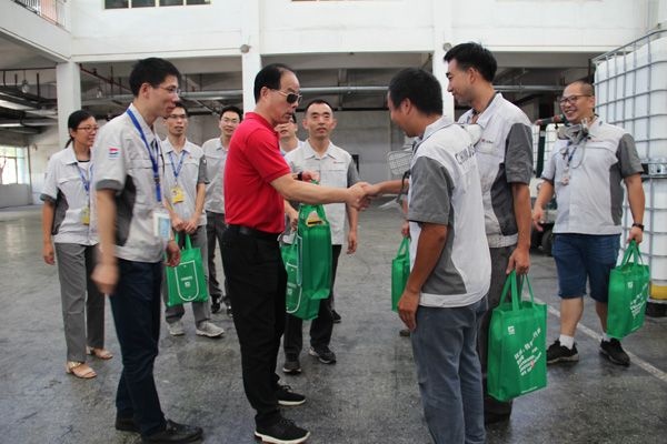張毓強(qiáng)總裁和丁成車副總裁來到二分廠制氈工段,由于是敞開式區(qū)域和烘箱的緣故,這里的溫度很高,工人們干活很辛苦。看到正在認(rèn)真干活的工人,張總關(guān)切地問:“怎么樣?熱不熱???”張總一一送上清涼禮袋,不停地說“謝謝你們!辛苦了!”